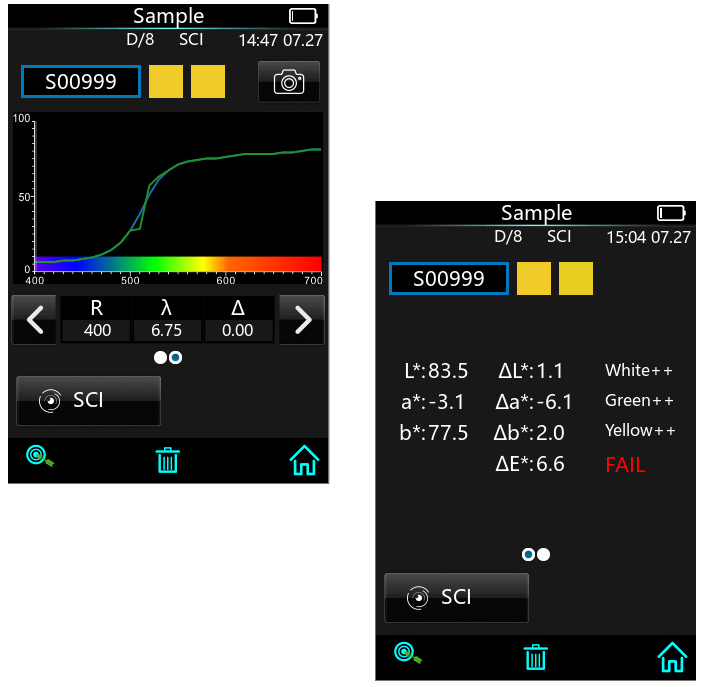 스펙트로컬러리더 CR7(기본형)은 반사율(사용자가 지정한 특정 파장에서의 반사율), 샘플 색도 값, 색차 값/그래프, 합격/불합격 결과, 색상 시뮬레이션, 색상 오프셋 등의 데이터를 직관적으로 표시할 수 있습니다. 보기 편리할 뿐만 아니라 사용자의 작업 효율을 크게 향상시켜 줍니다.