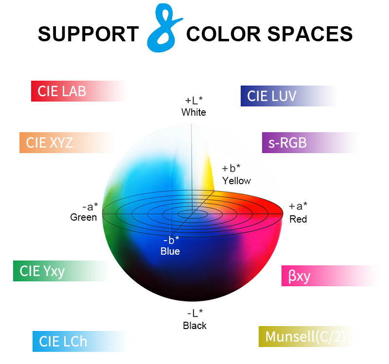 CIE LAB, XYZ, Yxy, LCh, CIE LUV, S-RGB, βxy, Munsell(C/2) 색 공간 및 D65, A, C, D50, D55, D75, F1, F2(CWF), F3, F4, F5, F6, F7(DLF), F8, F9, F10(TPL5), F11(TL84), F12(TL83/U30), B, U35, NBF, ID50, ID65, LED-B1, LED-B2, LED-B3, LED-B4, LED-B5, LED-BH1, LED-RGB1, LED-V1, LED-V2, LED-C2, LED-C3, LED-C5를 제공합니다. 또한 맞춤형 광원(총 41가지 광원, PC 소프트웨어/앱 소프트웨어를 통해 일부 구현 가능)을 제공하여 다양한 측정 조건에서의 특수 측정 요구 사항을 충족할 수 있습니다.
