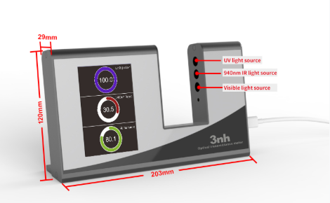 3nh에서 개발한 고정밀 광투과율 측정기 YT1010은 투명 물질의 투과율을 빠르고 정확하게 측정하도록 설계되었습니다. 380nm에서 760nm까지의 가시광선과 940nm에서 피크를 나타내는 근적외선 등 세 가지 광원을 채택했습니다.