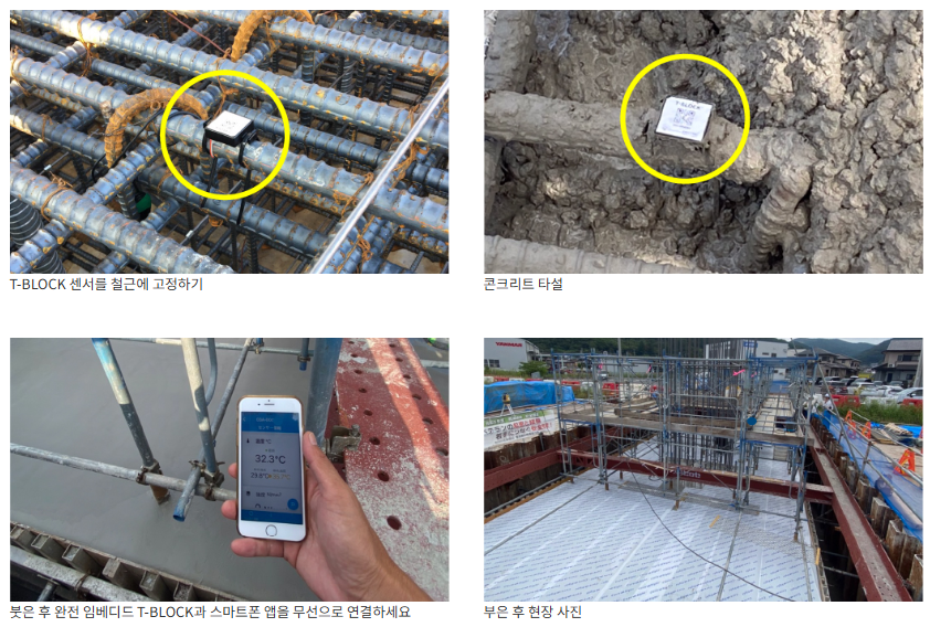 현장에서는 T-BLOCK이 외부 온도, 표면층, 심층 세 지점에 설치되며, 앱을 통해 콘크리트 경화 온도 변화를 측정하고 모니터링합니다.