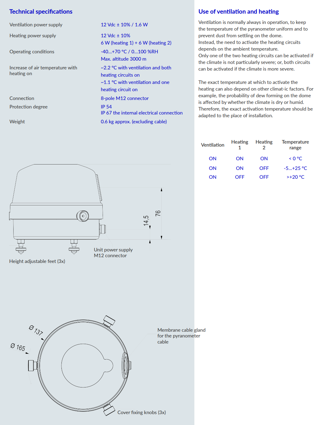 환기 및 적절한 난방 기능을 통해 특히 이른 아침 시간에 돔 표면에 이슬이 맺히는 것을 방지하여 온화한 기후에서도 훨씬 더 정확한 측정이 가능합니다. 난방 기능은 극한 환경 조건에서도 센서 돔에 눈이나 얼음이 생기는 것을 막기 위해 사용할 수 있습니다. 본 장치는 동일한 출력의 두 개의 독립적인 난방 회로를