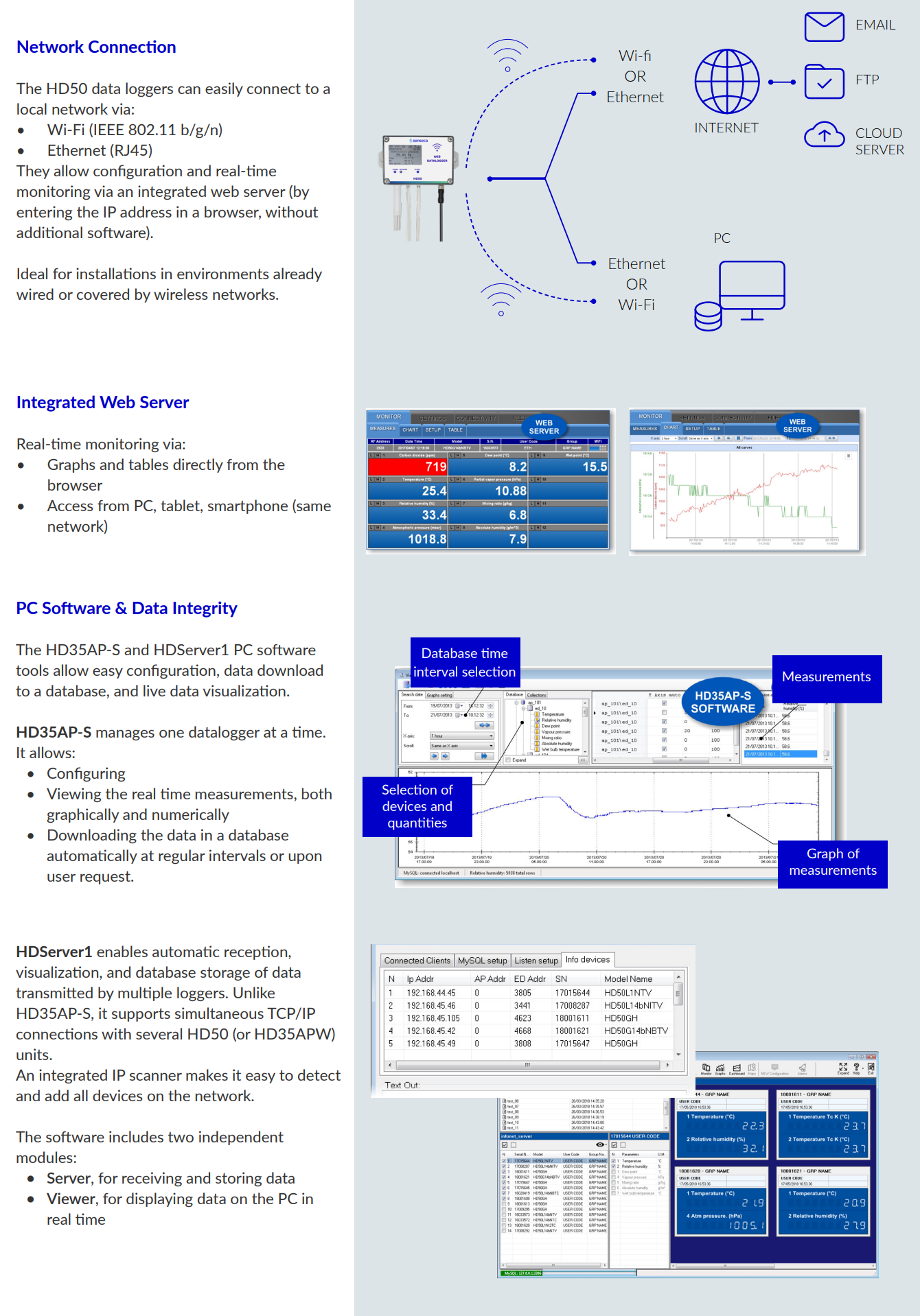 HD50은 하나의 데이터 로거로 시작하여 사실상 무제한의 로거 네트워크로 확장할 수 있습니다. HD50에는 웹 서버가 내장되어 있어 웹 브라우저를 통해 설정을 확인할 수 있으며, 이를 통해 실제 측정값을 모니터링할 수도 있습니다.